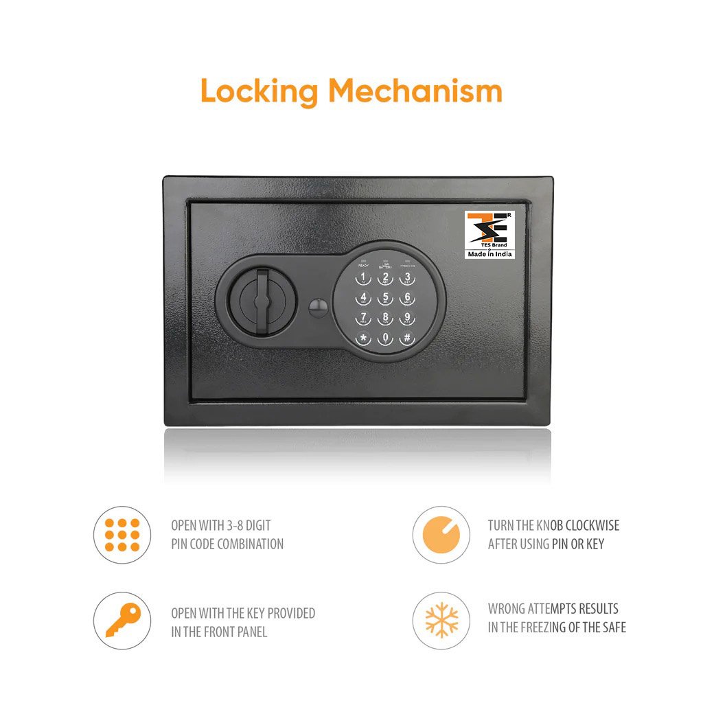 TES Brand offers Hotel Digital Safe box, with key passwords. This Product serves as a secure safe locker where visitors can make their own password and keep safe their valuable items. The Product is offered by TES Brand is a wall mount & almirah mount Digital Safe Locker Box to be fitted with screws. This is the product which ensures safety and privacy of your goods.
